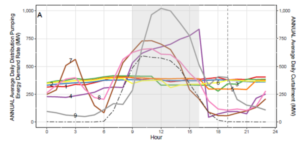 Annual average energy demand daily profile for the water sector under various pricing scenarios